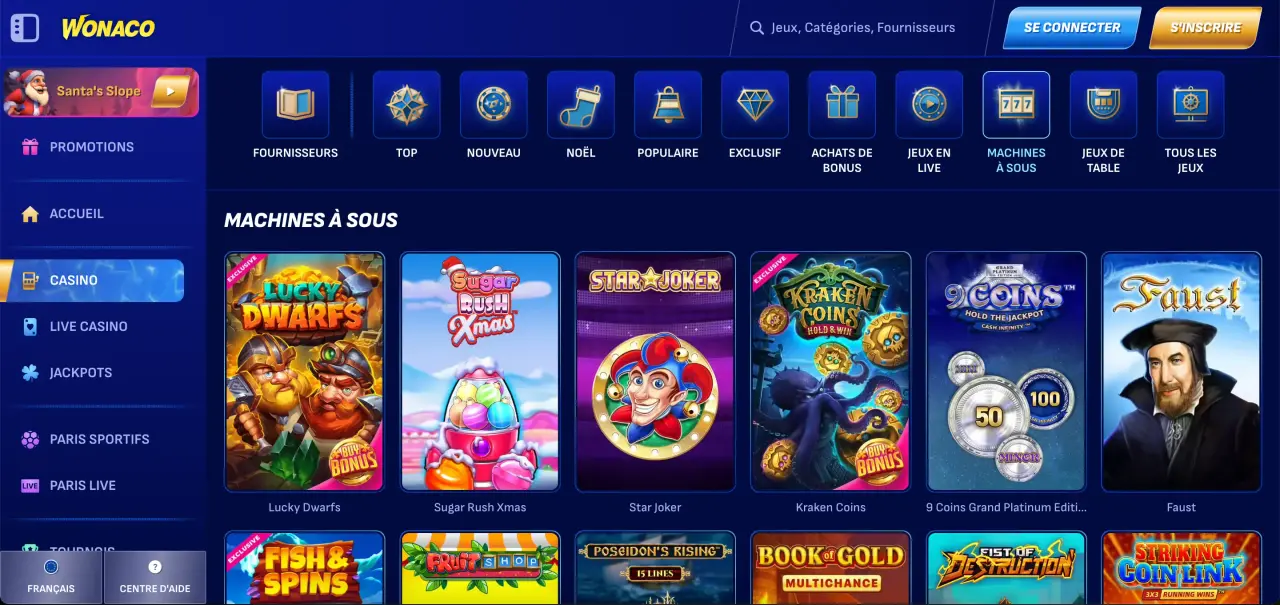 Nous avons découvert que le catalogue de Wonaco Casino est remarquablement bien garni. Avec plus de 4 500 jeux, la plateforme répond aux attentes de tous les types de joueurs. Voici un aperçu des catégories disponibles :
